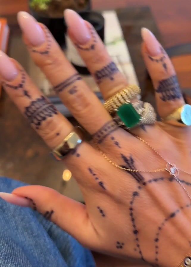 close-up of a person's hand with intricate black henna designs on the fingers and back of the hand