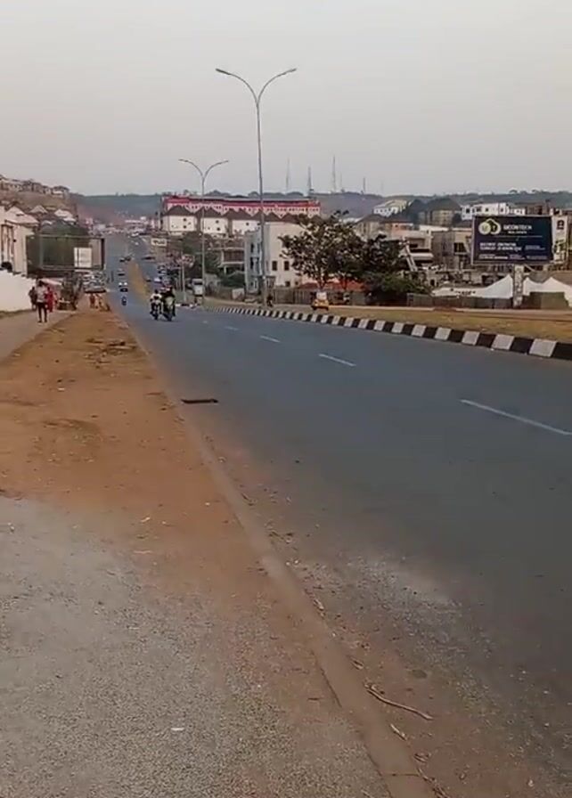 street in a city, probably in Africa. The sky is overcast. A few people are walking on the sidewalk. A few motorcycles are on the street. The street has black and white curb markers. Buildings are visible on the far side of the street. The street is asphalt. The sidewalk is a dirt path. Tall street lights line the street. A large advertisement is visible on the right side of the street.