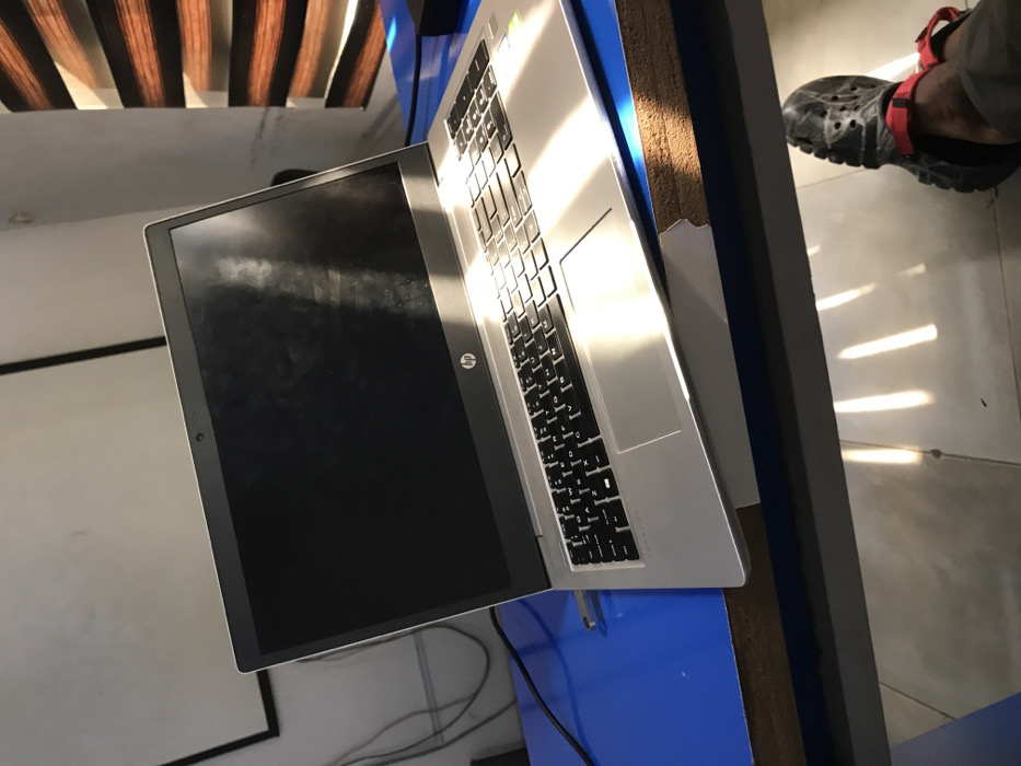 The image displays an indoor workspace, focusing on a silver HP laptop situated on a blue-topped desk. The laptop's screen is dark, showing reflections and light smudges. An HP logo is visible below the screen. A silver USB flash drive is inserted into the left side of the laptop. Direct sunlight, entering from the right, casts parallel streaks of light across the laptop's black keyboard, the blue desk surface, and the light-colored tiled floor. A dark, rectangular object is partially visible on the desk to the right of the laptop, with black cables present on the left side of the desk. In the background, a light-colored wall with a portion of a black-framed object (possibly a whiteboard) is visible on the left. To the right, vertical blinds with alternating brown and lighter-colored stripes indicate a window. The front edge of the blue desk on the right side shows a chipped section of its surface material. In the lower right corner, a human left foot, with dark skin, is visible on the tiled floor. The foot is wearing a gray/black closed-toe sandal featuring a red adjustable strap. The scene offers no discernible visual elements or landmarks specifically identifying the location as Calabar, Nigeria.