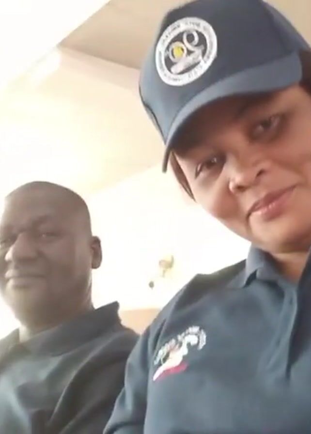 Three individuals are sitting on a row of chairs. The camera is held by the woman in the foreground. She is smiling at the camera. All three people are wearing polo shirts. The woman is also wearing a navy blue baseball cap with a logo on the front. The other two people are looking towards the left side of the frame. The location appears to be indoors, with white walls and a ceiling with fluorescent lighting. There is some sound in the background of someone speaking.