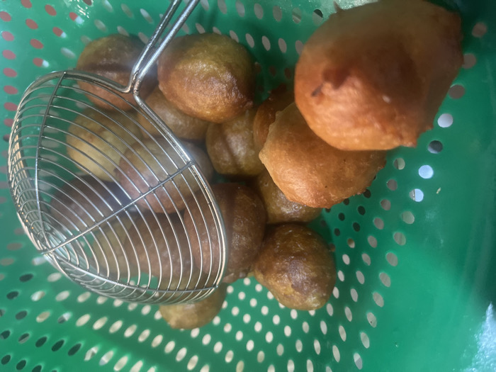 - "Several golden-brown, round beignets fill a green plastic colander" by FM-6wY0i1, licensed under CC BY 4.0