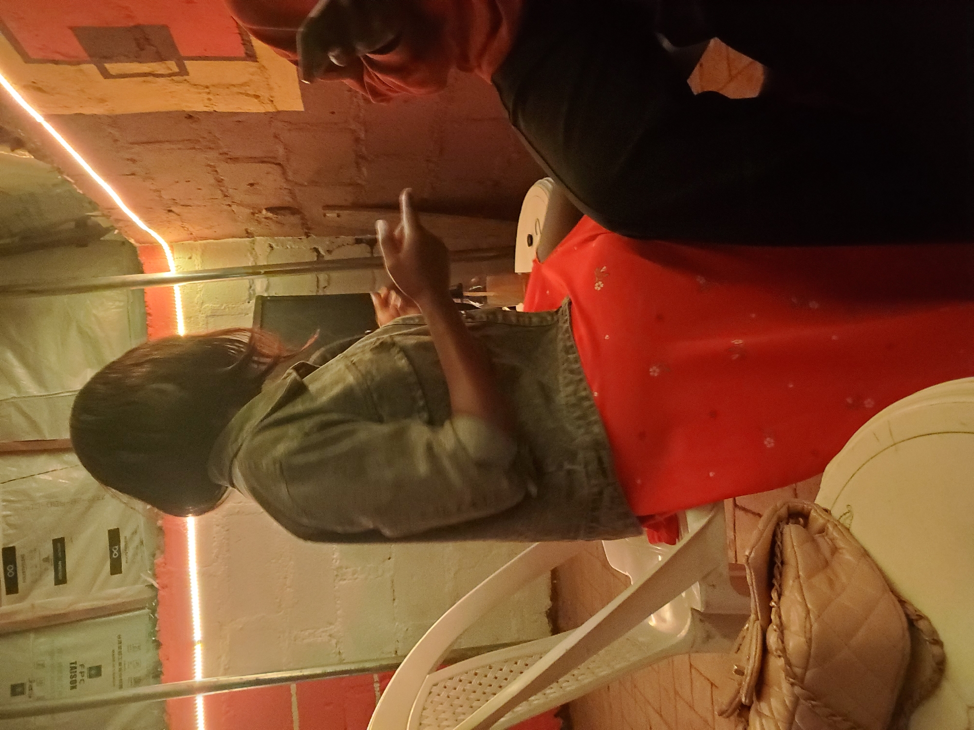 n indoor scene with two people. One person is seated on a white plastic chair, wearing a red skirt and a gray denim jacket. Their left arm is raised, with the middle finger extended. Another person, partially visible from above, is wearing a dark top. A light-colored quilted handbag hangs on the back of the chair. The background reveals a wall with exposed brick and wooden framing, illuminated by a string of lights. The location of Jos, Nigeria is not discernible from the image.