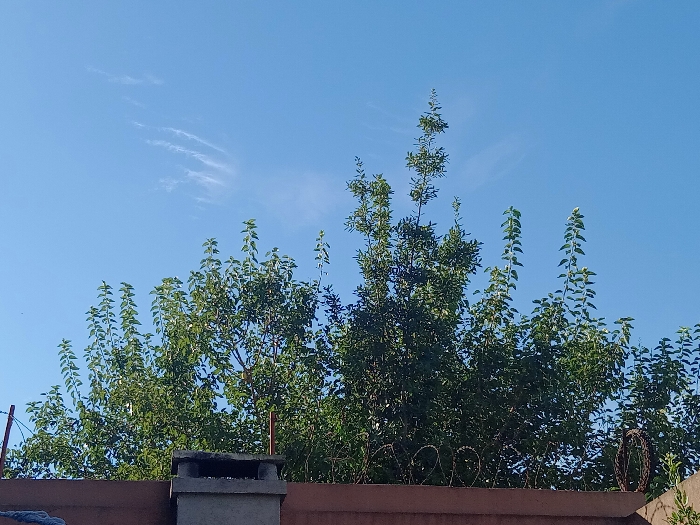 The scene depicts an outdoor daytime environment in Villa Ballester Noroeste, Argentina, characterized by a clear blue sky with minimal, wispy white cloud formations occupying the upper two-thirds of the frame. The lower third features a prominent reddish-brown wall, approximately one meter in height, topped with coiled razor wire extending from the center to the right edge. A grey, rectangular concrete chimney is observed positioned on top of the wall, slightly to the left of the image's vertical center. Dense green foliage from multiple trees rises above and behind the wall, with several branches exhibiting new, vertical growth reaching into the clear sky. Two thin, reddish-brown vertical posts are partially visible, one on the far left and another on the far right, adjacent to the wall. No human figures, animals, or discernible actions are present. The lighting is consistent with direct sunlight.