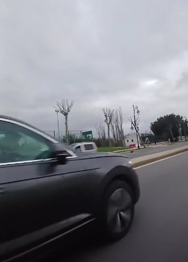gray Volkswagen Touareg driving on a paved road under a cloudy sky. The car is seen from the side and rear, with a brief view of the front at the beginning. There is a strip of greenery and a concrete median between the lane the Touareg is in and the opposing lane. Another car, a silver sedan, drives in the opposite direction. Bare trees and some with leaves are visible along the side of the road, along with streetlights. A soccer field can be seen beyond the trees. The video appears to have been taken from a moving vehicle.