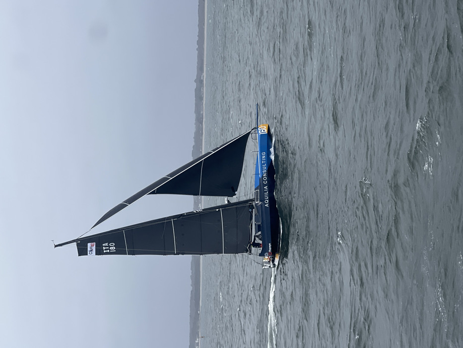 - "An offshore racing sailboat, identified as a Class40 "ITA 180" with "AQUILIA CONSULTING" branding on its dark blue hull and "PopEye" near the stern, navigates choppy, grey-blue water under an overcast sky in Lorient, France" by FM-nc9BE2, licensed under CC BY 4.0
