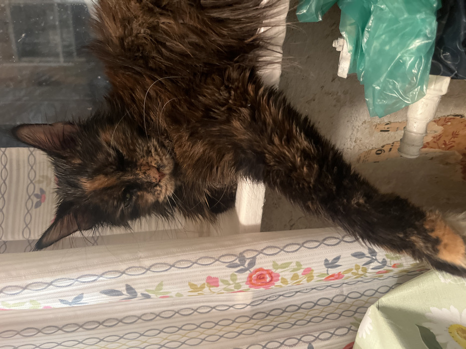 A tortoiseshell cat is resting upside down on a surface with a floral pattern. The cat's head is angled downwards with its eyes closed. Its long, dark fur appears damp or matted. The cat's tail dangles off the side. Behind the cat, there's a concrete wall with pipes and plastic bags hanging. The overall image is captured with a slightly tilted, close-up perspective.