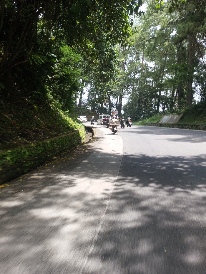 The image depicts a rural or semi-rural paved road in Khajuripada, India, observed from a low angle, likely from a moving vehicle, indicated by motion blur on the asphalt. The road curves gently to the right. On the left side, a steep, densely vegetated embankment rises, featuring a short, moss-covered retaining wall at its base. Tall trees with lush green foliage line both sides of the road, casting dappled shadows across the pavement. In the distance, several vehicles are present on the road, moving away from the viewer. These include multiple motorcycles, one prominent motorcycle-trolley with a light-colored cargo box in the mid-ground, a white passenger van, and a white sedan further back. Individuals are visible operating the motorcycles and the motorcycle-trolley. The sky is partially visible through the tree canopy, suggesting daylight conditions.
