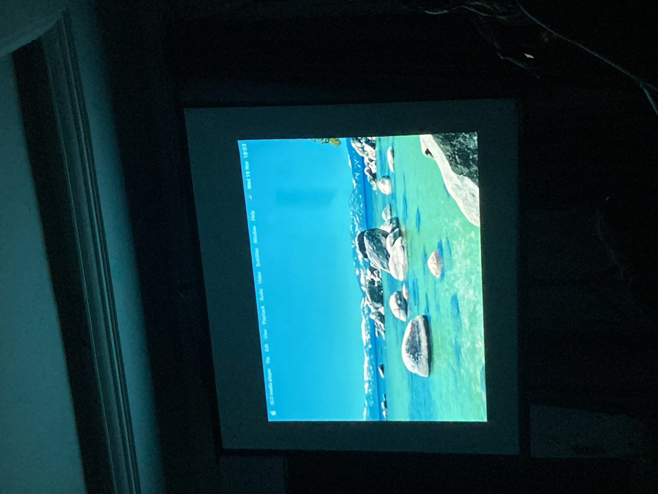 A screen displays a vibrant image of a lake or ocean scene. Large rocks dot the turquoise water, with mountains visible in the distance under a clear blue sky. The screen shows a menu bar at the top, indicating it is likely a computer or media player. The date "Wed 13 Mar 19:03" is visible. The screen is framed, and the surrounding environment is dark, suggesting it is being viewed in a dimly lit room.
