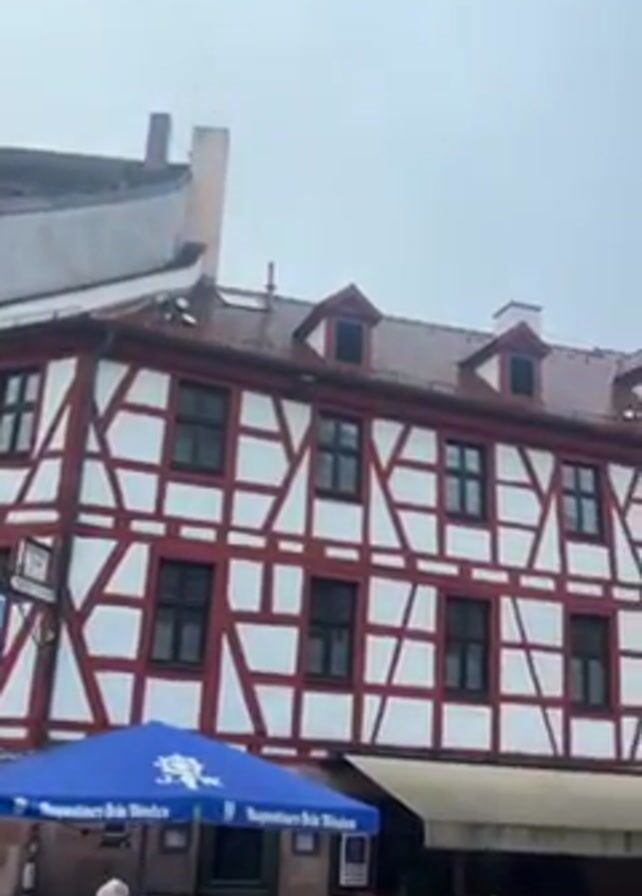 two half-timbered buildings, one primarily white with red framing and the other brown with white framing, under a cloudy sky. The buildings have multiple windows and red-tiled roofs with dormers. An awning covers part of the front of the building with red framing, and a blue umbrella with white lettering is in front of it. A person in a light-colored coat walks near the umbrella. The ground appears wet, suggesting it may have recently rained. The overall setting suggests a historical or traditional European town.