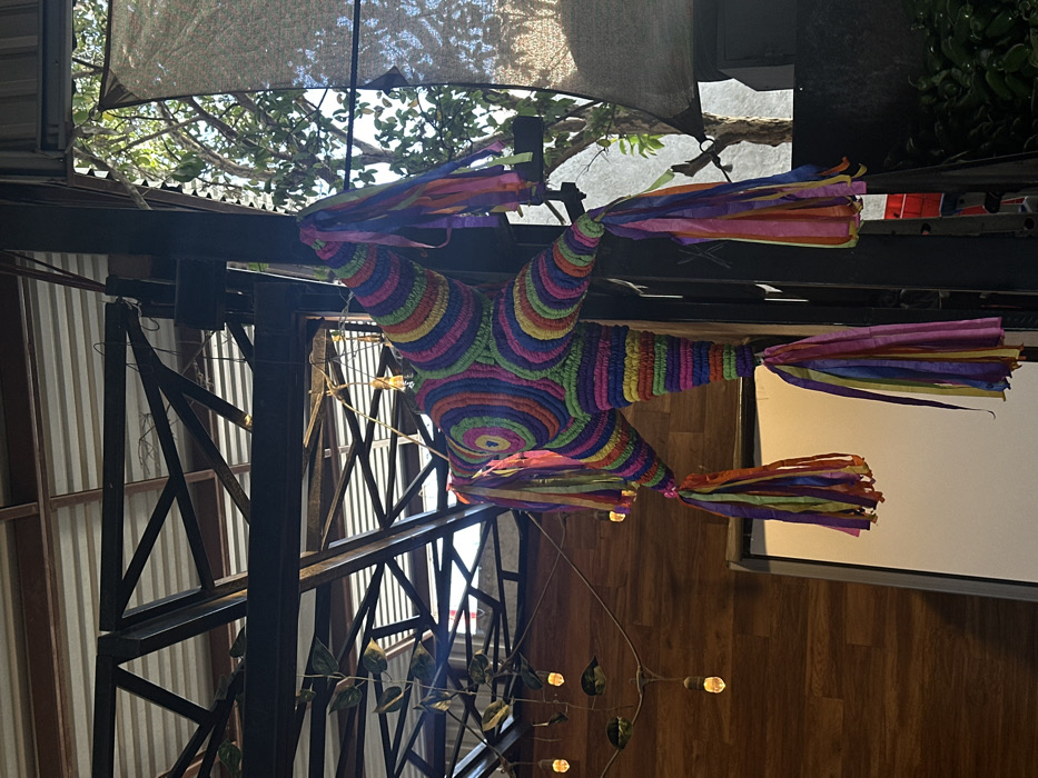A colorful, star-shaped piñata hangs from a metal structure, adorned with vibrant rainbow stripes and festive paper tassels. The structure itself is a network of black metal beams, creating an industrial-chic ambiance. Above, a canopy filters sunlight, casting soft shadows on the scene. Below, a decorative string of lights with leafy accents adds a touch of whimsy to the wooden wall.