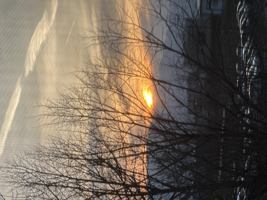 This image captures a sunset or sunrise over the city of Sopot, Bulgaria. The scene is dominated by the silhouette of numerous bare, deciduous tree branches in the immediate foreground, obscuring portions of the view. The sun, a prominent, intense yellow-orange orb, is centrally positioned on the horizon, partially obscured by a distant, dark mountain range or series of hills. The sky directly above the horizon displays vibrant orange and yellow hues, transitioning to lighter blue-grey towards the top of the frame, where scattered clouds and two distinct airplane contrails are visible. Below the distant hills, urban structures, including buildings and a large parking lot filled with numerous parked vehicles, are discernible in the midground, with vehicle surfaces reflecting ambient light. No individuals or specific actions are visible within the depicted environment.