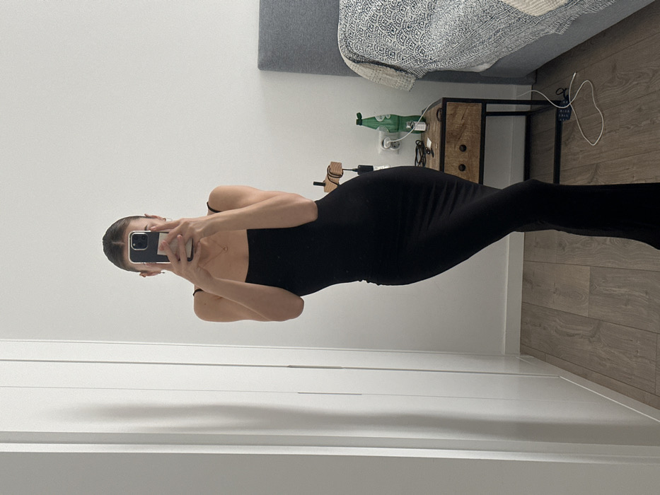 A person is depicted taking a mirror selfie in an indoor room, identified as a bedroom or dressing area located in Ericeira, Portugal. The individual is positioned centrally, wearing a form-fitting, black, floor-length strappy dress. Their face is obscured by a smartphone, held with both hands in a dark-colored case, pointed towards a reflective surface not visible in its entirety. A delicate necklace is visible around the person's neck. The environment features white walls and a light wood-look laminate floor. To the left, a segment of a white built-in wardrobe or closet with vertical panels is visible. To the right, a grey upholstered headboard and a portion of a bed covered with a light-colored, patterned throw are present. Adjacent to the bed is a rustic wooden nightstand with two dark drawer pulls and a dark metal frame. On the nightstand, a green glass bottle, a small wooden decorative object, and other miscellaneous dark items are arranged. A white cable rests on the floor next to the nightstand.