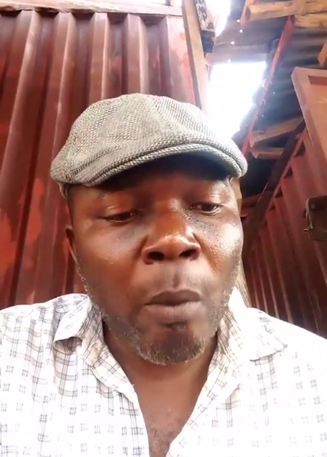 A middle-aged man with dark skin and a grey beard is positioned close to the camera. He is wearing a white and blue plaid shirt and a gray cap. His facial expression is serious and he appears to be talking. The background consists of red corrugated metal, potentially a shipping container, and a partially visible wooden roof structure with sunlight filtering through.