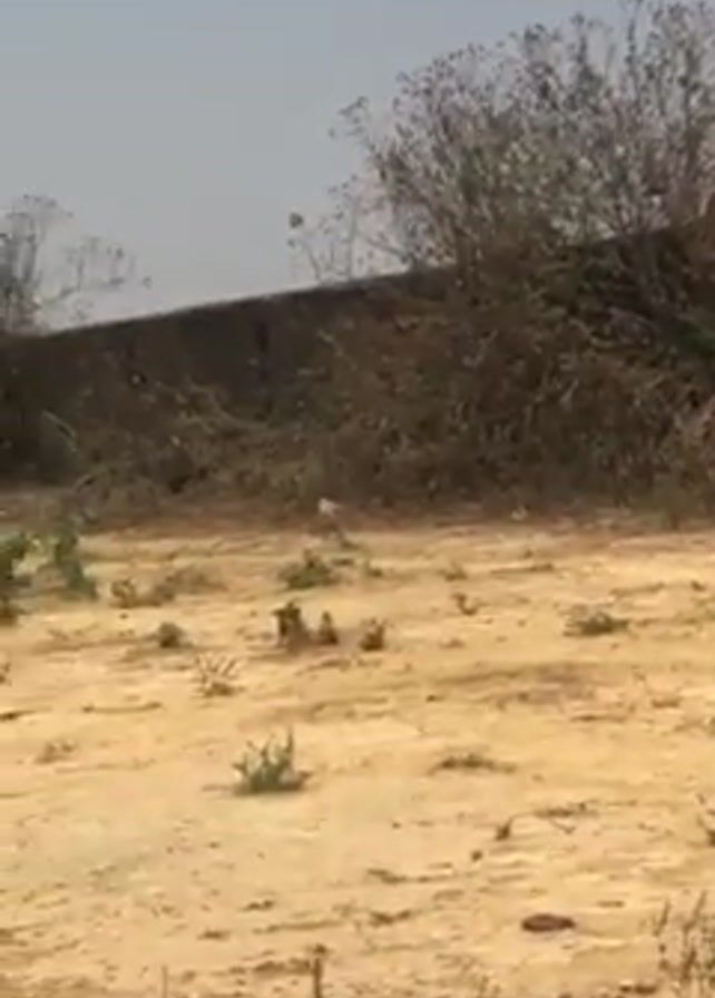 patch of dry, sandy land with scattered vegetation. A large bush or thicket runs along the back of the area. In the distance, there is a wall. The camera pans slightly across the scene. No people are visible. The only sounds are some indistinct voices and a laugh.