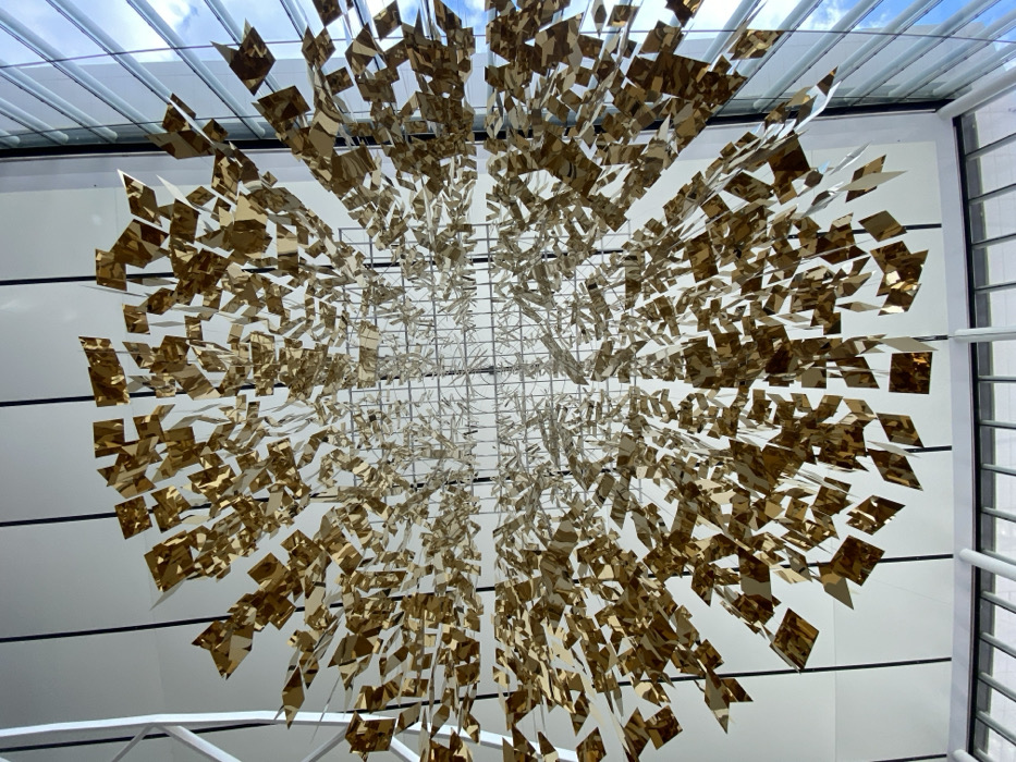 A suspended art installation is centrally featured, comprising thousands of individual, small, reflective golden or bronze metallic pieces