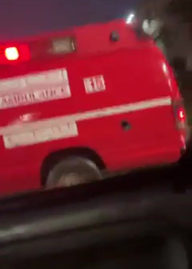 red ambulance with a white stripe traveling on a road at night, as viewed from inside another vehicle. The ambulance has Arabic writing on its side. The camera is shaky, and the focus is briefly lost. The interior of the car from which the video is shot is visible.