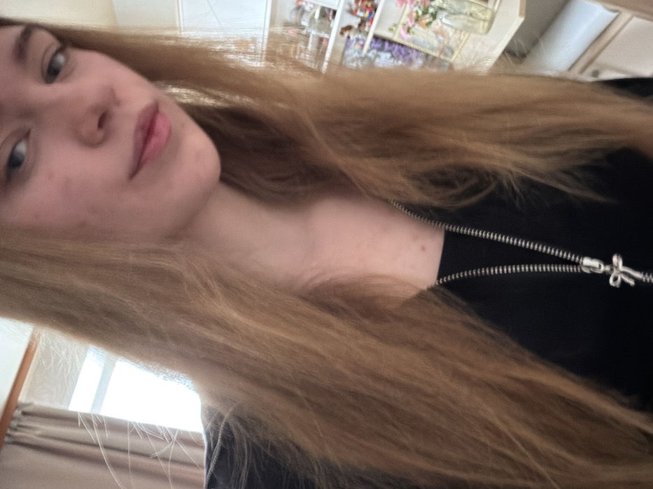 A close-up portrait depicts a young female subject positioned in an indoor residential setting. Her long, light brown hair cascades over her shoulders and chest, largely obscuring the details of her black garment. She wears a silver-toned zipper necklace with a decorative bow-shaped pull tab. Her face, partially visible in the upper right quadrant, shows fair skin with minor blemishes, light-colored eyes, and a neutral expression as she looks directly towards the viewer. The background is out of focus; to the left, a window with light-colored curtains is visible, admitting natural light. To the right, a white shelving unit contains assorted objects including bottles, potentially flowers, and framed pictures. The specific location within Chaikovsky, Russia, cannot be determined from the visual information provided.