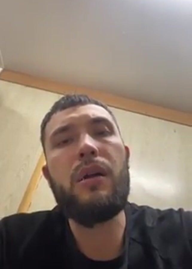 man with short dark hair and a full beard looking directly at the camera. He is wearing a black t-shirt with a design on it. He appears to be indoors, in a room with light-colored, paneled walls and a white ceiling. A light fixture is visible in the ceiling. The man has a toothpick in his mouth and his expression is neutral.
