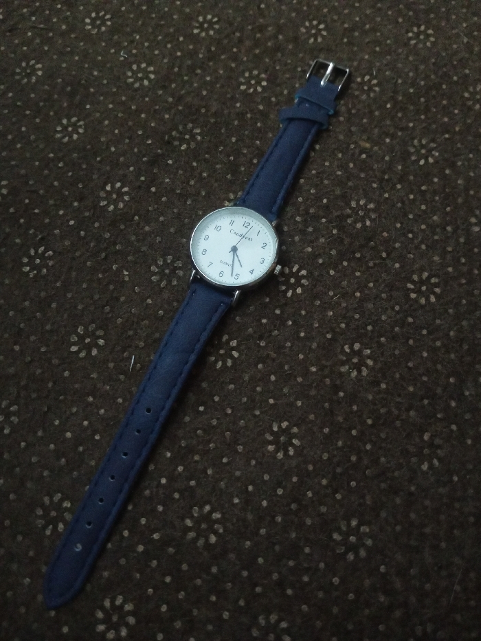 - "A silver-rimmed wristwatch with a white face and blue leather band is displayed against a dark brown textured background with a floral pattern" by FM-xbDAm1, licensed under CC BY 4.0