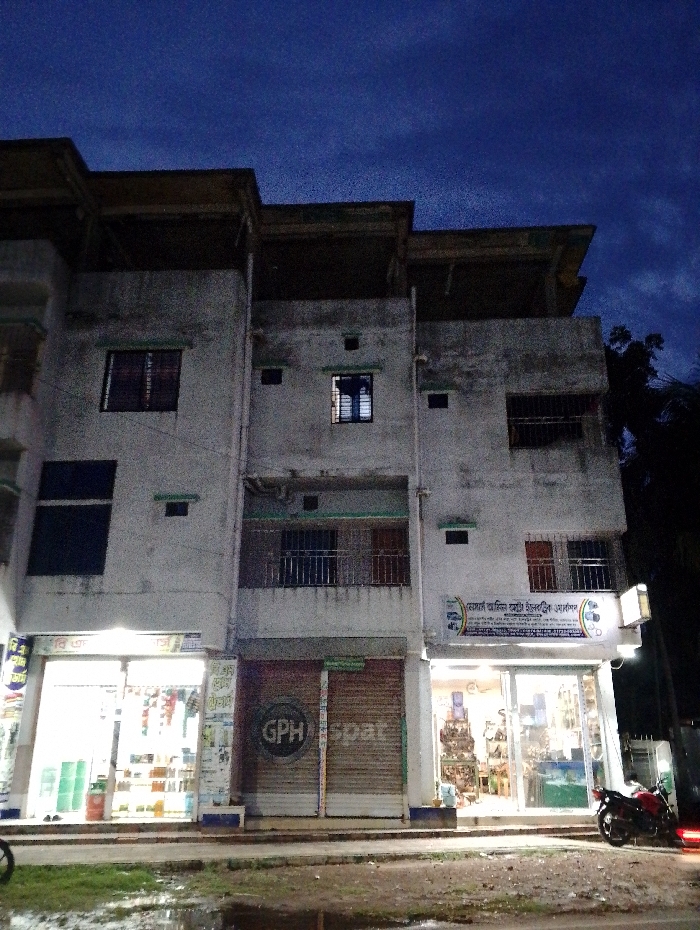A two-story building with a flat roof stands on a street corner in Bhola, Bangladesh, under a dark blue sky