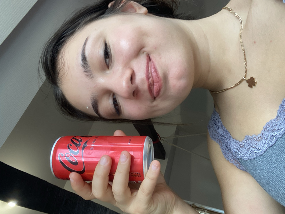 A female individual is depicted in a close-up, head-and-shoulders portrait, smiling and holding a red Coca-Cola can with her right hand in the upper left portion of the frame