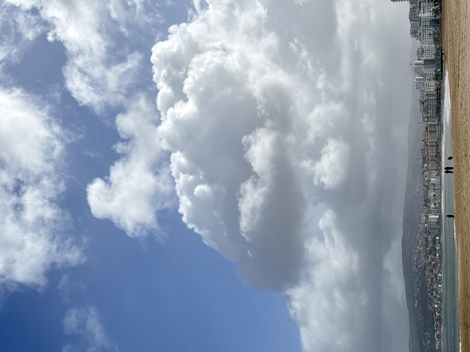 The image displays a wide view of Tangier Bay, Morocco, under a partly cloudy sky. Voluminous cumulus clouds, varying in brightness and shadow, occupy the majority of the sky, with patches of clear blue sky visible, primarily in the upper left. The foreground features a wide, light brown sandy beach leading to the dark blue-green water, where small waves break. Four human figures are present on the beach: one individual stands alone on the left, closer to the water's edge, while a group of three stands together further right, with one figure appearing to be crouched or seated on the sand. In the midground, a dense line of multi-story buildings, predominantly light-colored, forms the city's waterfront. Behind the urban structures, a range of green, vegetated hills extends across the horizon, partially obscured by atmospheric haze.