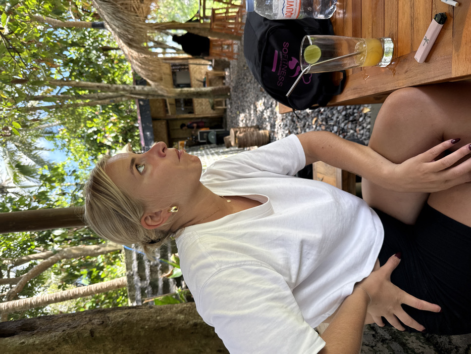 A blonde-haired female, appearing to be in her 20s or 30s, is seated at a wooden table in an outdoor café setting in Sangkan Gunung, Indonesia