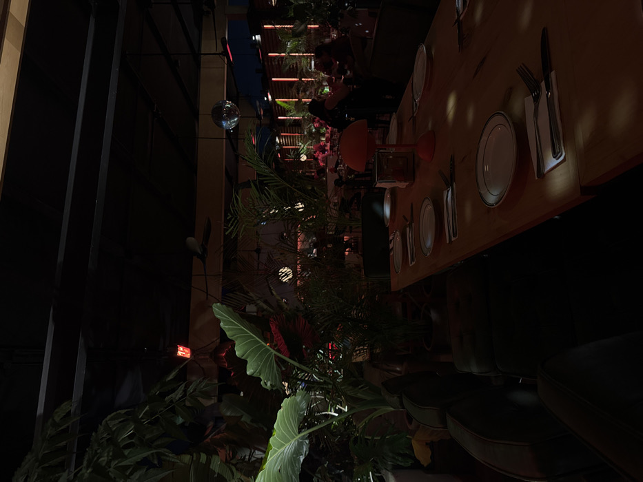 A dimly lit indoor restaurant presents a table set for dining. The table is decorated with plates, cutlery, and a red centerpiece. Lush greenery and plants enhance the ambiance around the table. Soft lighting creates a warm, inviting atmosphere. A disco ball hangs in the background, adding a touch of festivity. The focus is on the table setting and the surrounding foliage, contributing to a relaxed and stylish dining experience.