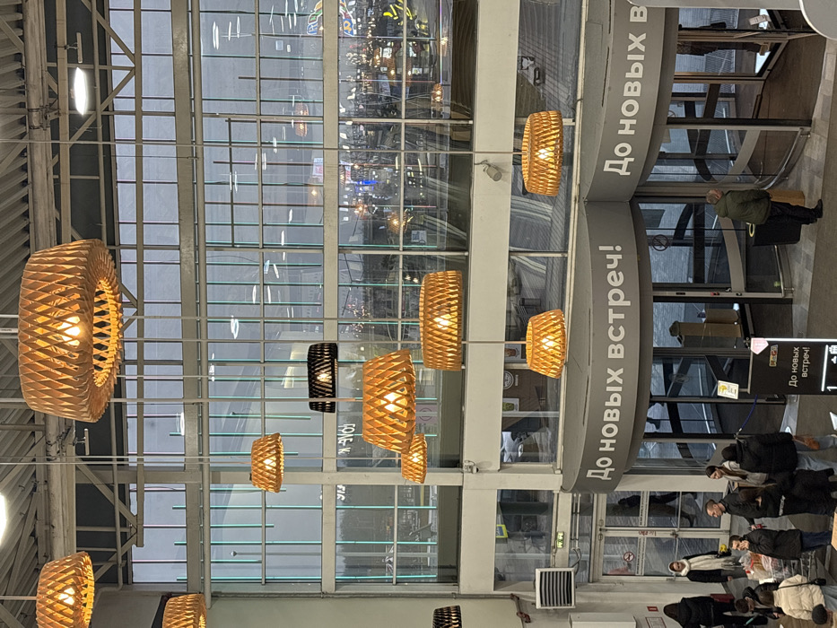 The image displays an indoor scene, likely a shopping mall or airport, characterized by a high ceiling with numerous decorative, circular light fixtures of varying sizes. A large glass facade allows natural light to flood the space, while a revolving door welcomes or dismisses people. A group of people are gathered near the exit, appearing to be shoppers or travelers, while a man with luggage is exiting through the revolving door. The signage reads "До новых встреч!", which translates to "See you again!" in English.