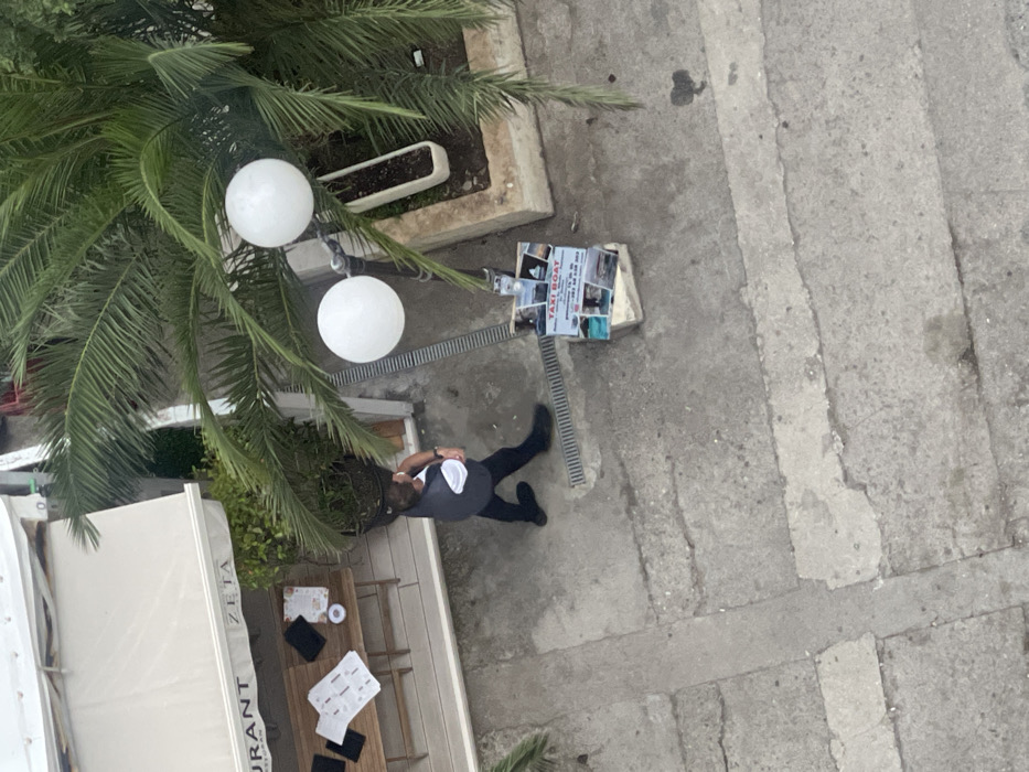 From an elevated perspective, a man in dark pants and a light-colored vest stands near a drain cover on a paved area. A sign supported by stones sits nearby. A palm tree with spherical lights hangs over the drain cover and sign. A building with "RESTAURANT ZETA" printed vertically on its awning is visible to the left, along with tables, chairs, and objects on them.