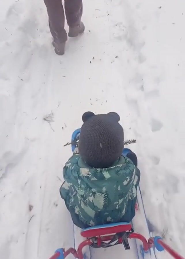 A young child, wearing a dark gray knit hat with bear ears and a green and blue patterned winter jacket, is being pulled on a small red and blue sled through a snowy path. The child is facing away from the camera. Ahead of the child, an adult wearing brown trousers and brown boots walks, creating a track through the snow. The ground is covered in white snow with scattered debris such as twigs and leaves. The video appears to be shot from behind the sled, capturing the point of view of the person pulling it. The overall scene depicts a winter outing in a snowy environment.