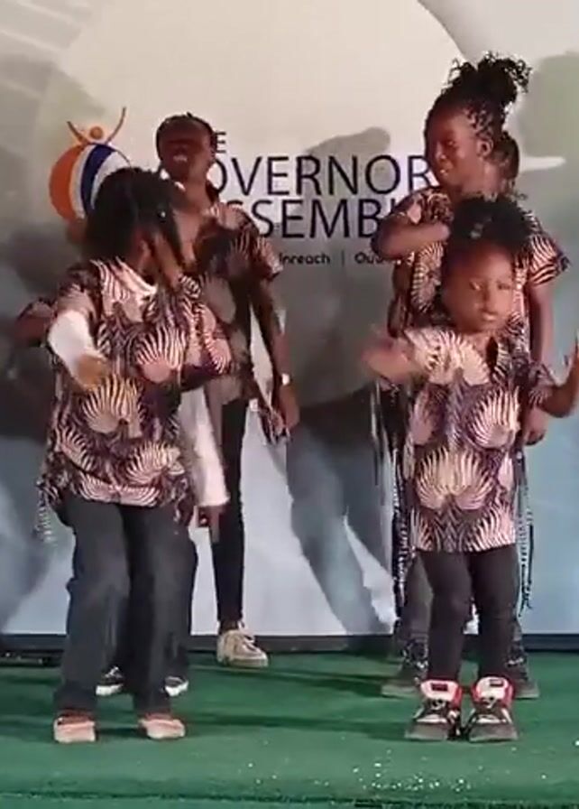 A group of seven children and one adult woman are dancing on a green stage in front of a backdrop that says “The Governor’s Assembly, Outreach”
