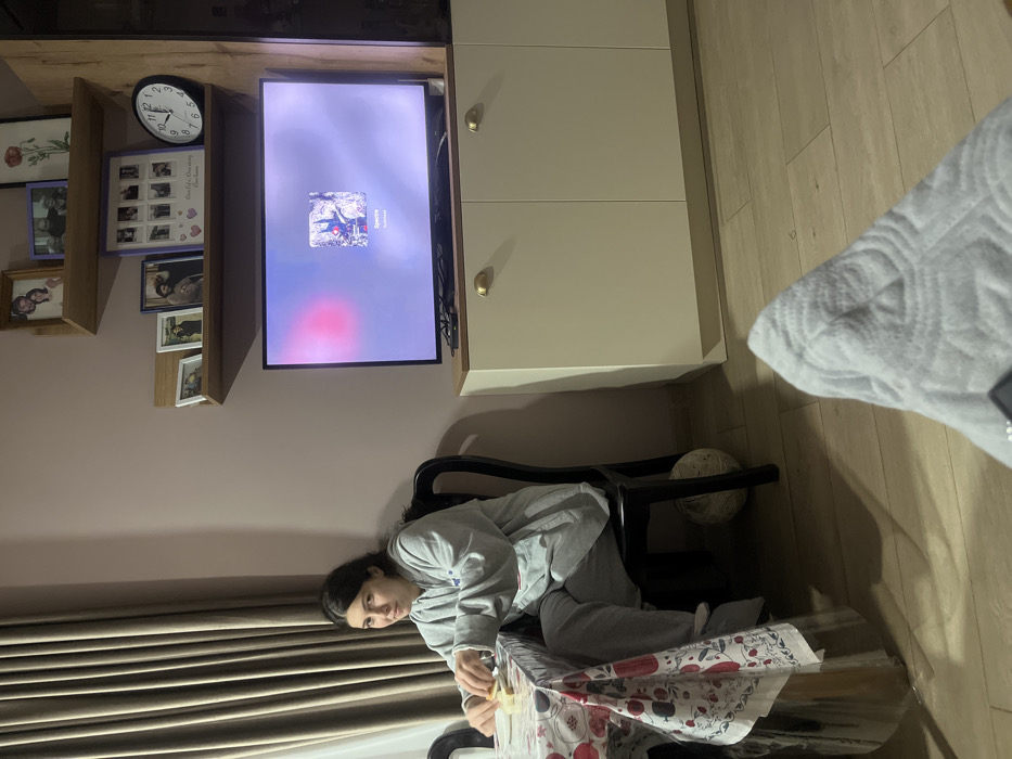 The image depicts an indoor domestic setting within Tbilisi, Georgia. A young adult female, dressed in a grey hooded sweatshirt and matching sweatpants, is seated at a rectangular dining table on the left side of the frame. Her dark hair is casually styled, and she is looking directly towards the camera with a neutral expression, holding a piece of bread or pastry in her hands over a plate. The table is covered with a white tablecloth featuring red and grey fruit or floral patterns. Below the table, a light-colored, possibly worn, ball is visible on the light wood-patterned floor. On the right side of the frame, a flat-screen television is centered on a cream-colored cabinet with a wooden top and two brass-colored pull handles. The television screen displays a media interface with the word "Spectre" and "Unlisted" below it, against a blurred background dominated by pink and purple hues. Above the television, two wooden floating shelves are mounted on a pale pink wall. The shelves hold various framed photographs, including portraits and a floral print, a purple framed item, and a black circular wall clock indicating approximately 12:45. Light-colored vertical curtains are drawn on the far left, partially obscuring a window. The photograph is taken from a low, first-person perspective, with a light-colored, patterned textile covering the photographer's legs visible in the bottom right foreground.