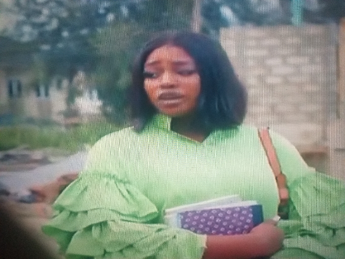 The image depicts an outdoor scene in Masaka, Nigeria, captured as a photograph of a digital screen, exhibiting significant pixelation. The primary subject is an adult female, positioned in a frontal view, slightly angled to her left. She has dark, shoulder-length hair and a fair complexion. She is wearing a light green top with a high collar and distinct tiered ruffles on the sleeves. Her mouth is slightly open, and her eyes are directed slightly upward and to her left, suggesting a moment of speech or reaction. She holds two books or notebooks in her left arm/hand; the top one has a purple patterned cover. A brown strap, likely from a bag, is visible over her right shoulder. In the background, to the subject's immediate right, a light-colored concrete block wall is visible. Further left and in the distance, blurry green foliage and a faint, blurry building structure with visible windows are present. The ground appears to be unpaved, with some green growth.