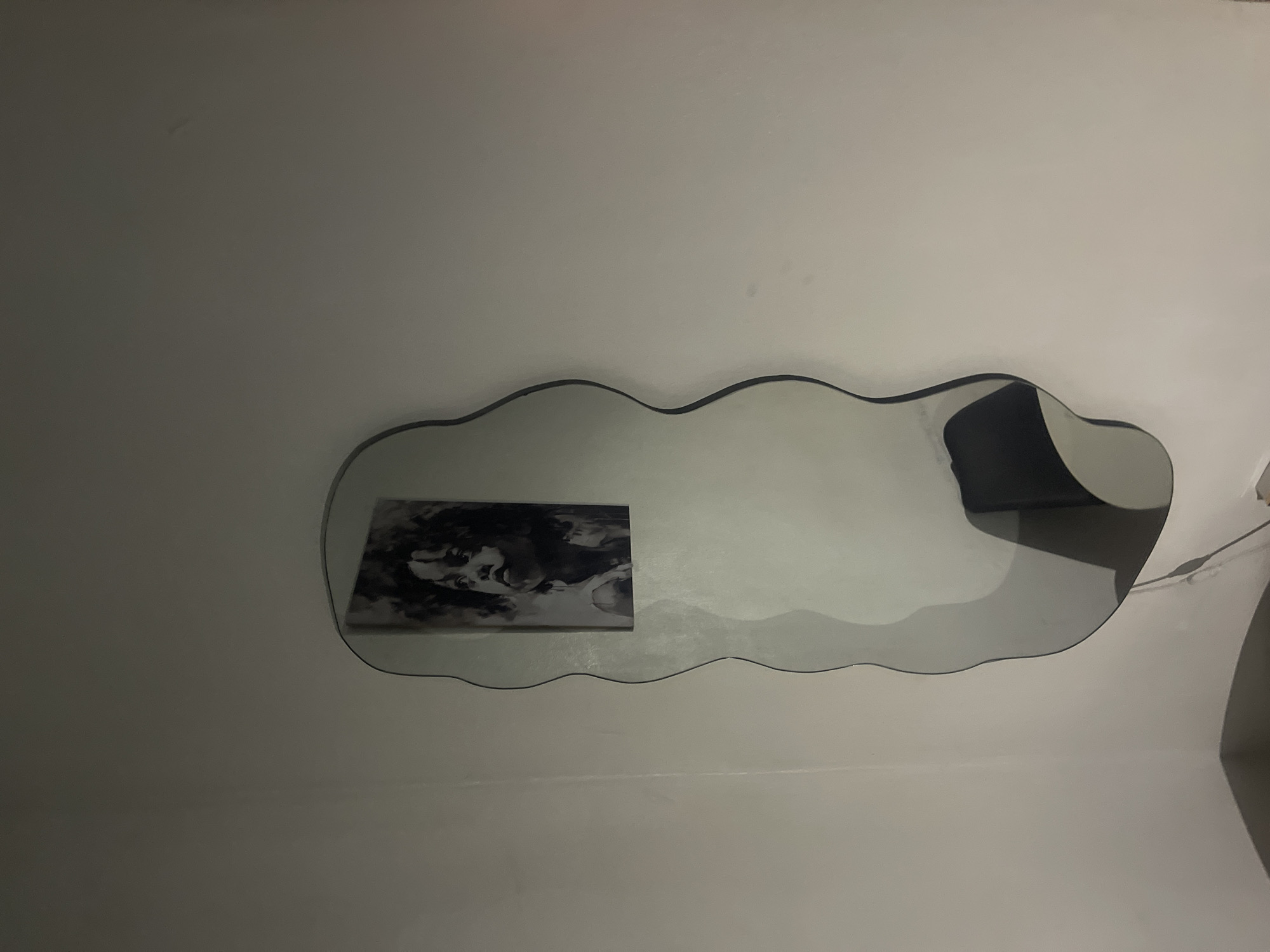 A wavy-edged mirror hangs on a white wall