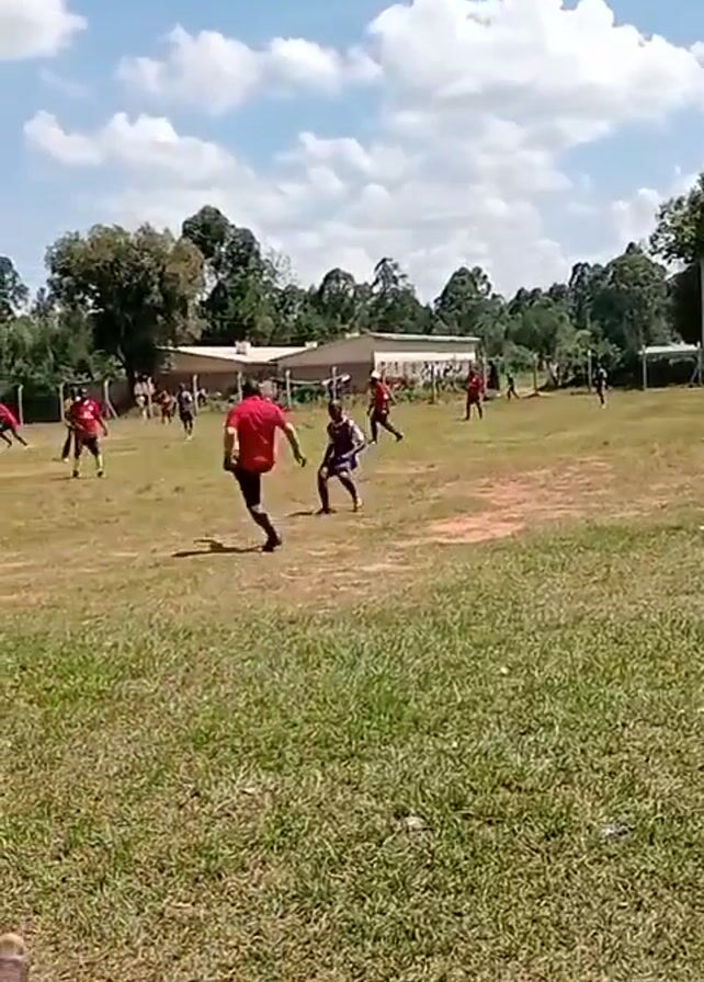soccer game being played on a grassy field on a sunny day. The players are wearing different colored jerseys, mostly red and blue. A person is filming the game, and their hand is briefly visible in the foreground at the beginning of the video. In the background, there are trees and a few buildings. During the video one player falls to the ground. The video ends with the refree blowing a whistle.