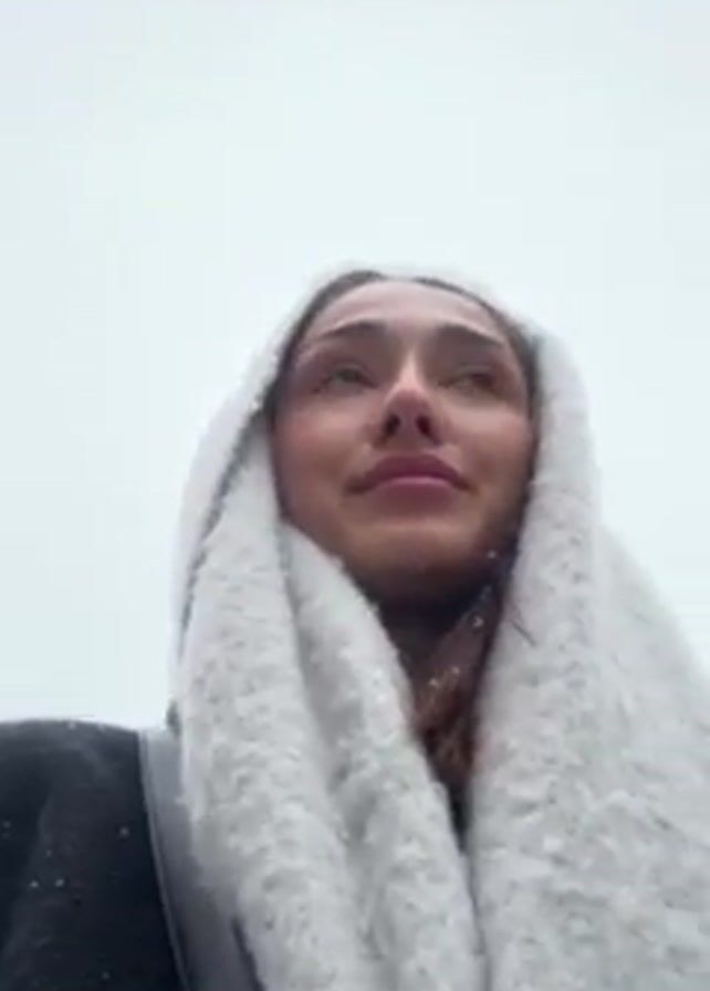 A woman with fair skin, light brown hair, and pink lips looks upward with a slight smile on her face, her head and shoulders are framed by a large, light grey, textured scarf, pulled up over her head, resembling a hood. She is wearing a dark-colored jacket on her left shoulder. The background is an overcast sky with light snowfall, and a building is partially visible on the upper right. The camera angle is low, looking up at the woman.
