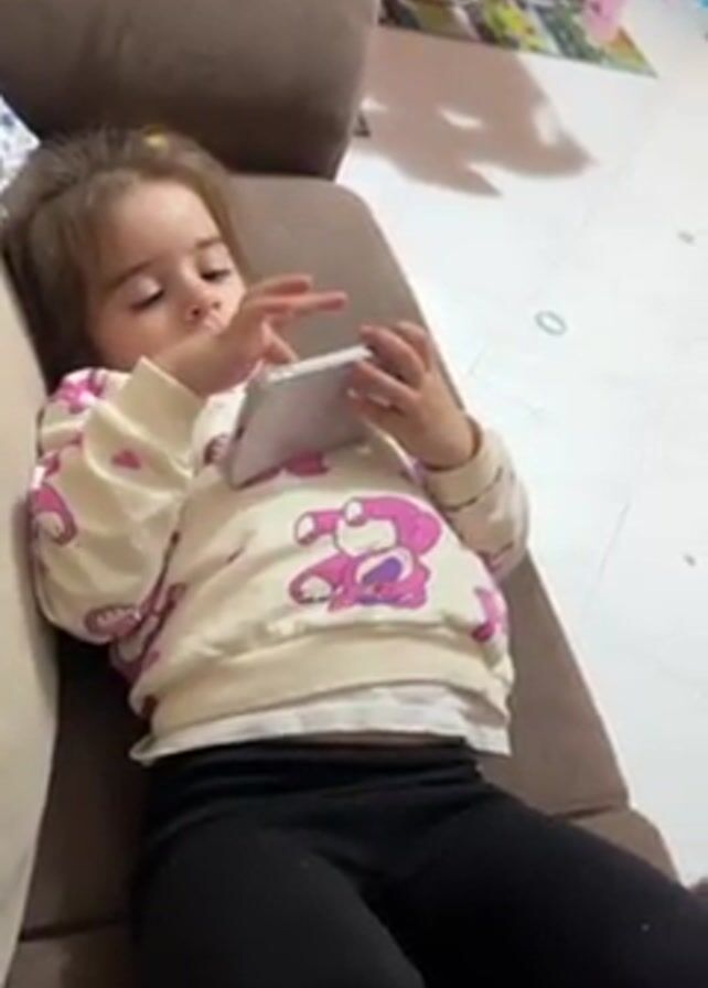 A young girl lies on a brown couch, intently focused on a white smartphone she holds with both hands. She is wearing a light-colored sweatshirt with pink bear prints, a white undershirt, and black leggings. The couch has a plush, rounded back, and the girl is positioned to the left of the frame. The floor is light-colored and tiled, and various items, including clothing and toys, are scattered in the background, partially obscured by shadows.