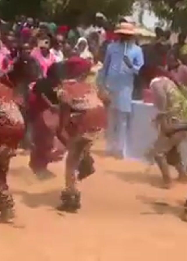A group of people in traditional costumes are dancing in a circle, kicking up dust. There are drummers on the side, and a crowd of people watching. A man in a blue suit and hat is standing near a table covered in a yellow cloth. The ground is dirt, and there are trees in the background.