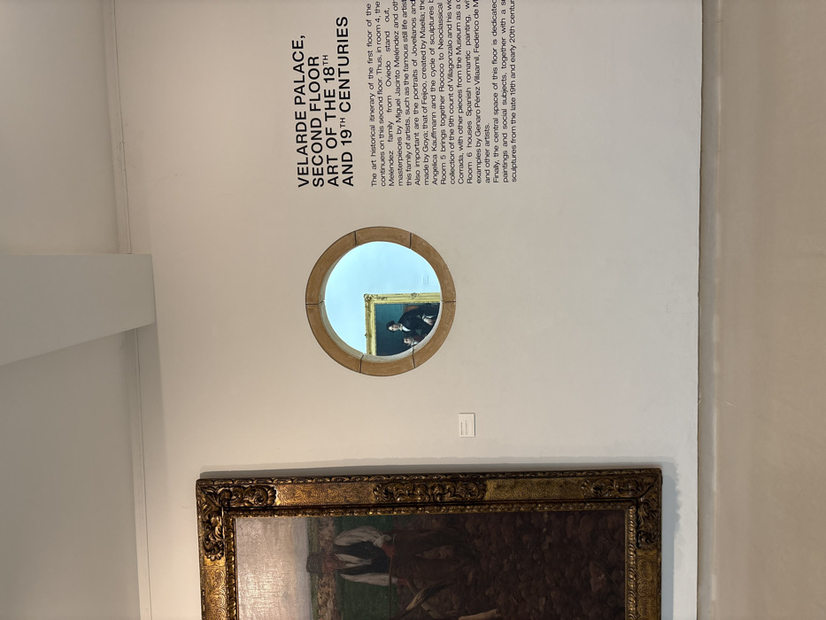 The scene depicts an interior view within the Velarde Palace, Second Floor, part of the Museum of Fine Arts of Asturias in Oviedo, Spain. The environment features light-colored walls, a matching ceiling with a visible white beam, and a neutral-toned floor. On the left side of the frame, a large, vertically oriented oil painting is displayed, enclosed in an elaborate gold frame. The painting depicts the upper torso and head of a male figure, wearing a hat and vest, situated in a field of dark tilled soil. The lower portion of the painting is not fully visible. To the right of this painting, a circular opening with a light brown or stone frame is set into the wall, offering a direct view into an adjacent exhibition room. Visible through this aperture is a portion of another framed portrait, showing a figure in dark, historical attire against a light, possibly blue, background. To the far right, black text printed on the wall identifies the exhibition as "VELARDE PALACE, SECOND FLOOR ART OF THE 18TH AND 19TH CENTURIES" and provides a detailed curatorial description of the collection, mentioning artists and the thematic arrangement of the rooms.