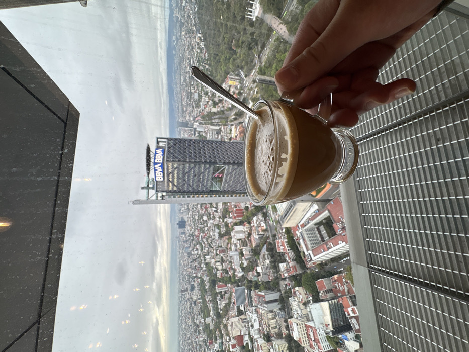 The image presents a high-angle view of Mexico City, Mexico, observed from an interior location through a window. In the immediate foreground, a human right hand holds a clear glass cup containing a light brown, frothy beverage with a silver spoon partially submerged. A metallic grate structure forms the bottom edge of the immediate foreground. Through the window, the extensive urban landscape of Mexico City unfolds under an overcast, grey sky. The prominent BBVA Tower, located on Paseo de la Reforma, is centrally featured, displaying its distinctive grid facade and multiple BBVA logos, with a helipad visible on its roof. To the right of the BBVA Tower, a large green area identifiable as Chapultepec Park is visible amidst the city's buildings. The horizon reveals hazy distant mountains, consistent with the surrounding terrain of Mexico City. Reflections of interior light sources are discernible on the window glass.
