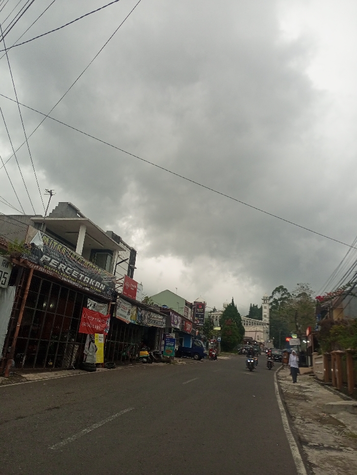 A street view under a heavy, overcast sky. Buildings line the left side of the road, displaying various storefronts, including one with "Percetakan" visible. Motorbikes and a few cars travel along the asphalt road. A lone pedestrian walks on the sidewalk to the right, adjacent to a low, brown brick wall. In the distance, a white building with a distinctive tower is seen amidst the trees. Utility lines stretch across the sky, adding to the urban scene.