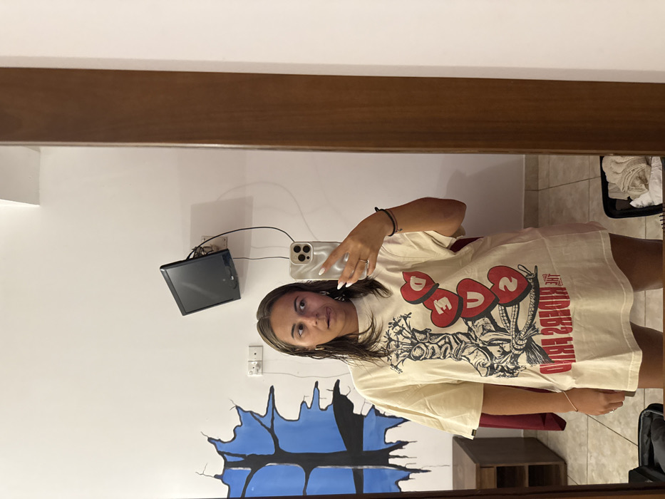 An individual, identified as female, is captured taking a mirror selfie in an indoor setting within the city of Thissamaharama, Sri Lanka. The subject, with wet, dark hair, light brown eyes, and fair skin, directly faces the camera, holding a light-colored smartphone with a visible case in her right hand. She displays a playful expression, with her eyes slightly crossed and her tongue slightly extended. She wears an oversized, light beige t-shirt featuring a graphic design of a cowboy boot adorned with flowers, alongside a vertical stack of four red heart shapes. The hearts contain mirrored text, appearing to spell "DEAD" or "DUD" on the top two, and "ZUR" on the third, with "THE RIDERS FRIEND" written below. Accessories include gold hoop earrings, white nail polish, a ring on her left ring finger, and a dark bracelet on her right wrist. The background, reflected in the mirror, reveals a white wall partially covered by a stylized blue and black tree mural on the left. A small, black flat-screen television is mounted on the wall above eye level, slightly tilted, with exposed black wiring trailing downwards. Below the television, a white double electrical outlet with switches is visible. To the left, a dark wooden bedside table or small cabinet with a drawer is present, draped with a dark red fabric. The floor is tiled with light-colored square tiles. In the bottom right corner, a dark open container or bag holds light-colored fabric. A prominent dark brown wooden frame borders the right side of the mirror.