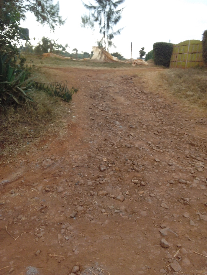 A rough, dirt road stretches into the distance, covered with rocks and patches of worn earth. Vegetation lines the left side, with tall, green plants contrasting the dry, brown grasses. Further ahead, a clearing contains piles of earth or sand. A dark green hedge and gate sit on the right. Trees are silhouetted against a somewhat bright sky.