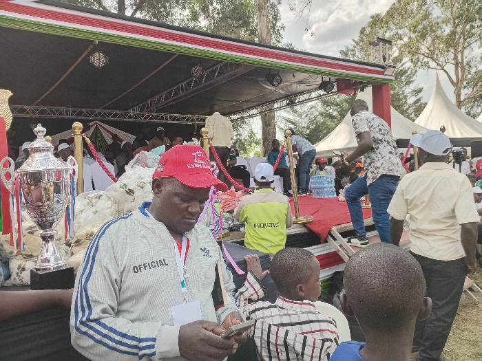 An outdoor event features a stage decorated with Kenyan flag colors. A man wearing an "OFFICIAL" jacket and a red cap is in the foreground, seemingly occupied with a phone. A large trophy stands beside him. On the stage, people move around, some carrying water bottles. A tent is visible in the background, and several people are watching the activity on the stage. Two children are also present in the foreground, observing the scene.