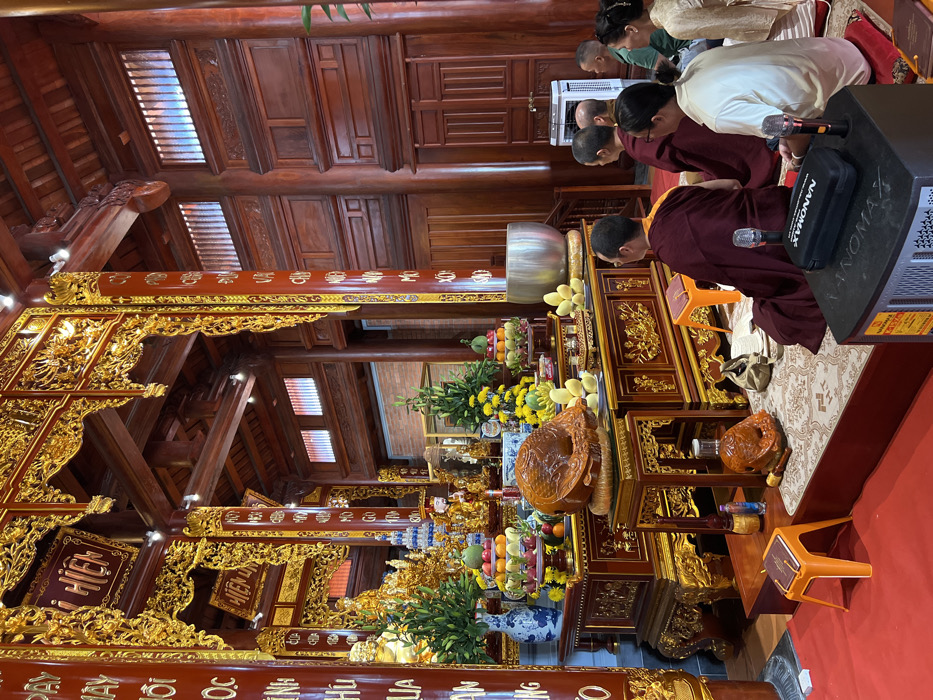 Inside a temple, monks and individuals gather, bowing in prayer towards an altar adorned with offerings of fruit, flowers, and religious artifacts. The space boasts intricate, ornate gold detailing on dark wooden beams and structures. Natural light filters through the ceiling. A loudspeaker sits to the side.