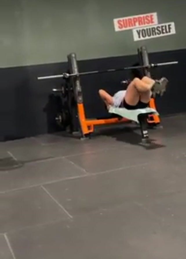A woman is doing an abdominal workout on a bench press in a gym. The woman is wearing shorts and a light-colored t-shirt. She is lying on her back on the bench with her legs elevated and bent at the knees. Her hands are behind her head. She is doing crunches, lifting her torso up towards her knees. The bench is part of a larger bench press machine with a barbell. The machine is orange and black. The floor is dark gray tile. On the wall behind the bench, there is a sign that says "SURPRISE YOURSELF" in orange letters. The gym appears to be sparsely populated. The lighting is fairly bright and uniform. The camera is stationary and captures the full body of the woman and the immediate surroundings. There's music playing in the background.