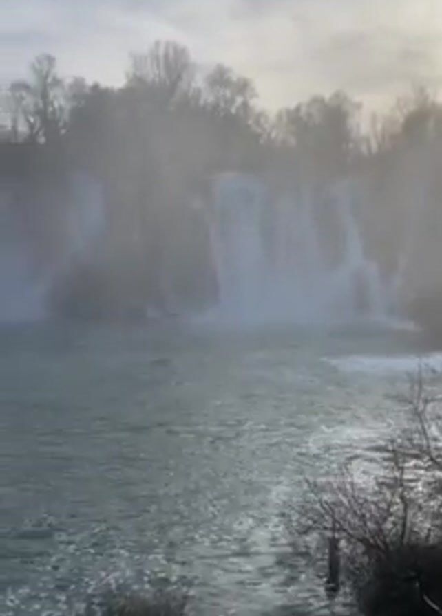 waterfall cascading into a river, captured under a cloudy sky. The scene appears somewhat hazy, possibly due to mist or spray from the waterfall. Trees are visible along the upper bank of the river, with bare branches suggesting it may be winter or early spring. The river's surface is turbulent, reflecting the daylight above. In the foreground, there's a sparse bush, and the camera slightly shifts its position, revealing more of the scenery.