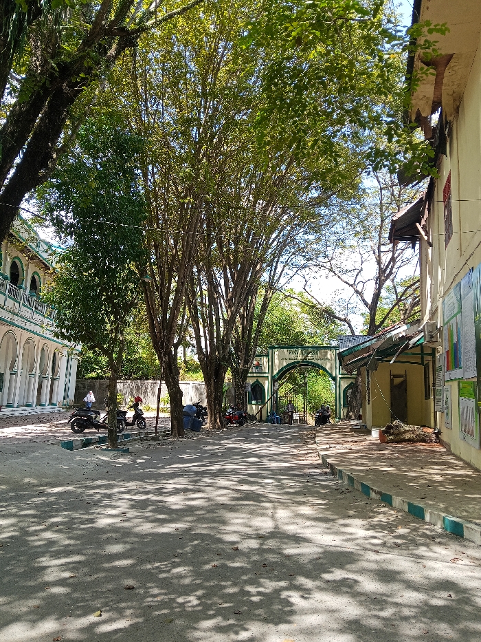 An outdoor scene features a tree-lined path leading to an ornate archway. Motorcycles are parked near a building with arched windows and green trim. The ground is covered in shadows, and another building is visible on the right with posters on its wall. The architecture and the lush greenery suggest a tropical or subtropical location.