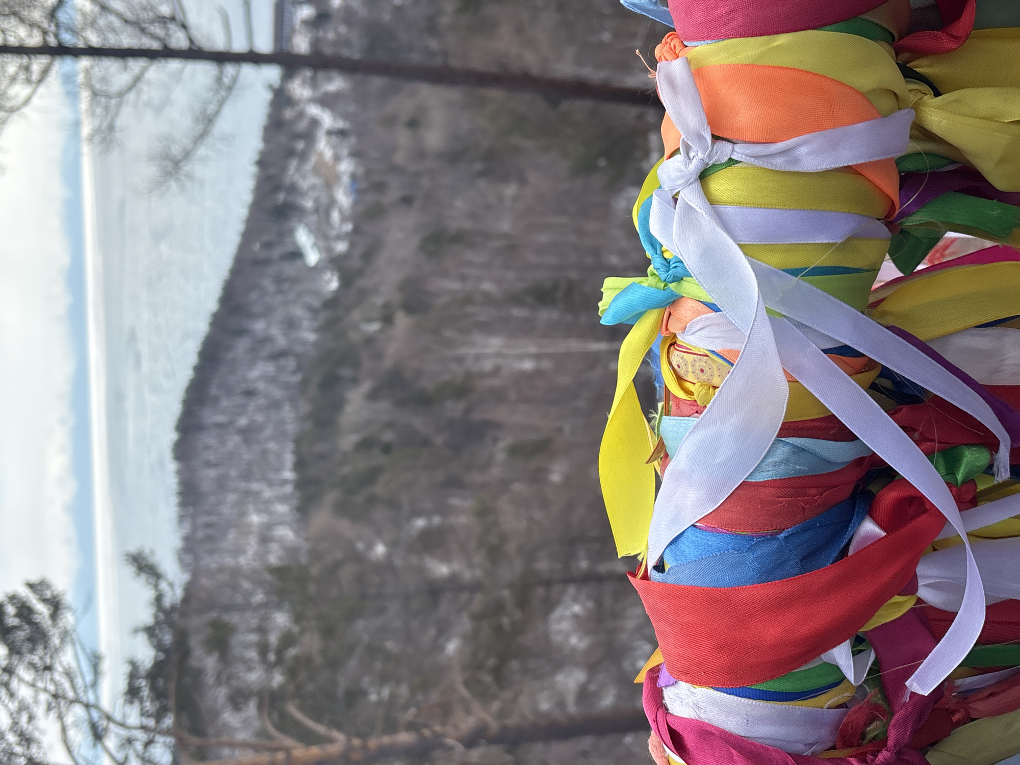 The image displays a dense foreground of numerous multi-colored fabric ribbons tied to an unseen horizontal structure, likely a railing. The ribbons vary in width and material, featuring prominent colors such as red, yellow, blue, green, orange, pink, white, and light blue, secured with various knots and bows. The background, significantly blurred, depicts a winter or early spring landscape in Nikola, Russia. A snow-dusted, forested hillside with mostly bare or sparsely leaved trees descends towards a large body of water, identified as Lake Baikal, which appears partially frozen or covered in ice. Small, indistinct structures are visible on the distant part of the hillside. The sky above the lake is overcast. Out-of-focus portions of tree trunks are visible along the left and right edges of the frame. No individuals are present in the scene.